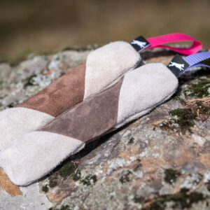 Koska materiaali on aitoa nahkaa, se myös käyttäytyy sen mukaisesti. Lelua ei kannata kastella eikä ole parhaimmillaan myöskään pakkasella, koska kastuessaan nahka luonnollisestikin kovettuu ja se vaikuttaa lelun kestävyyteen ja käyttöikään. Nahka luonnon materiaalina pysyy kestävimmillään ja myös mukavan pehmeänä, kun lelu pysyy kuivana. Tämä lelu ei siis välttämättä ole märimpien treenien paras lelu, mutta todennäköisesti koiran mielestä ihana superpalkka silloin, kun on oikea aika lelun käyttämiselle.
